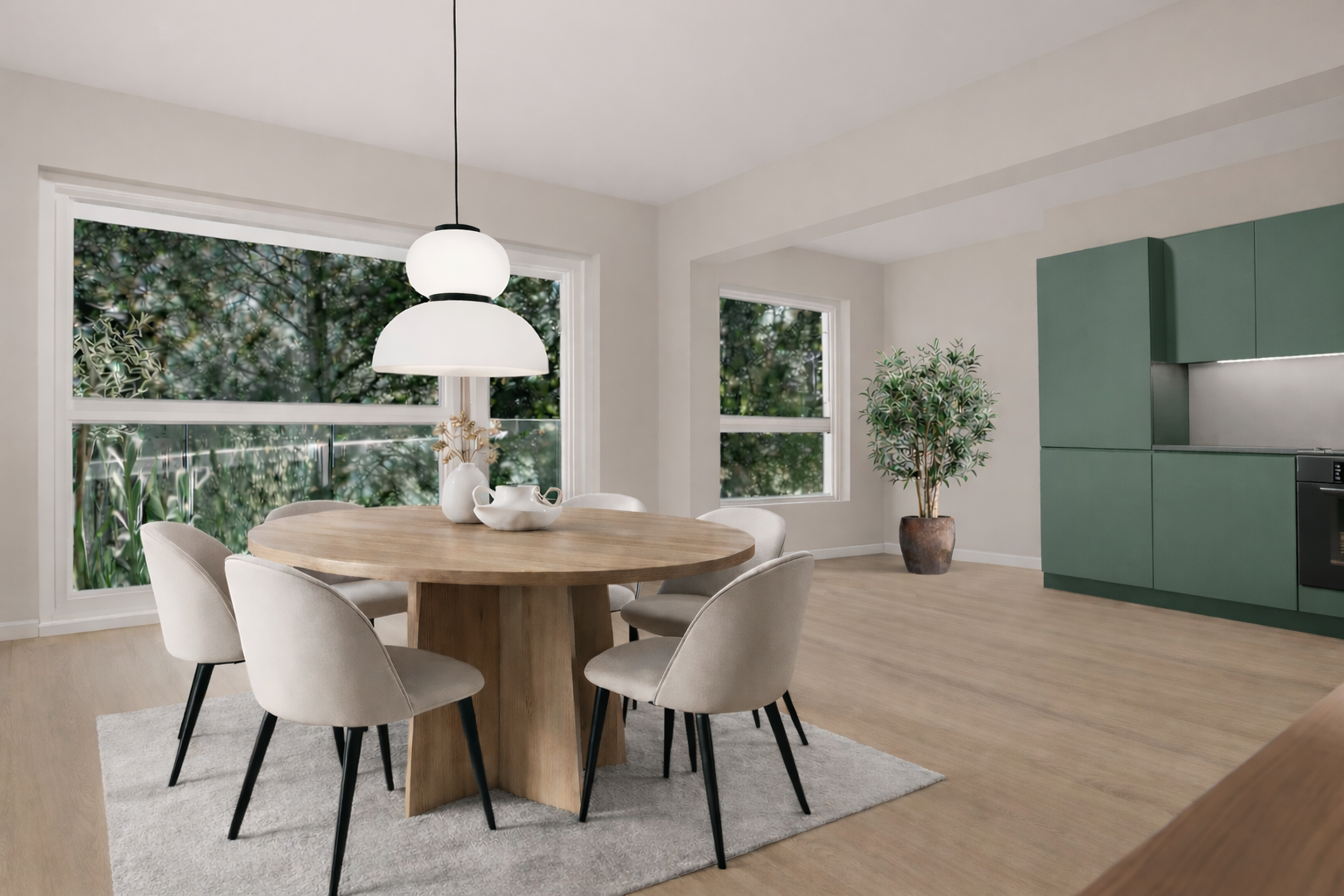 Leiligheten får stue med åpen kjøkkenløsning. I spisestuen får du plass til middagsgjester, samtidig som det er plass til sofa og tilhørende møblement i stuen. Her er det lagt opp til at kjøperne ved behov kan sette opp vegg slik at leiligheten har tre fullverdige soverom, alternativt kan deler av spisestuen brukes til å etablere en ekstra bod. Det bestemmer du etter eget behov!